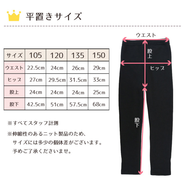 [105サイズ] ウエスト22.5、ヒップ27、股上24、股下42.5 [120サイズ] ウエスト24、ヒップ29.5、股上24、股下51 [135サイズ] ウエスト26、ヒップ31.5、股上24、股下57.5 [150サイズ] ウエスト29、ヒップ33、股上25、股下68 ※すべて平置き実寸サイズ(スタッフ計測) |