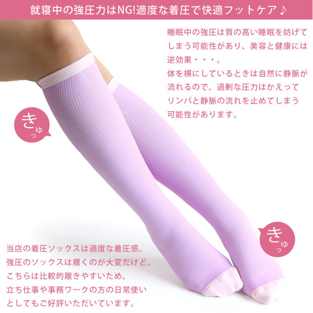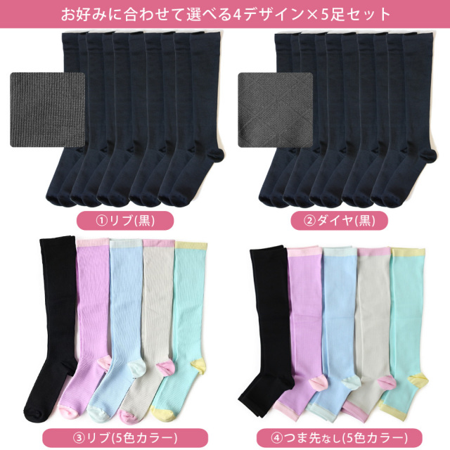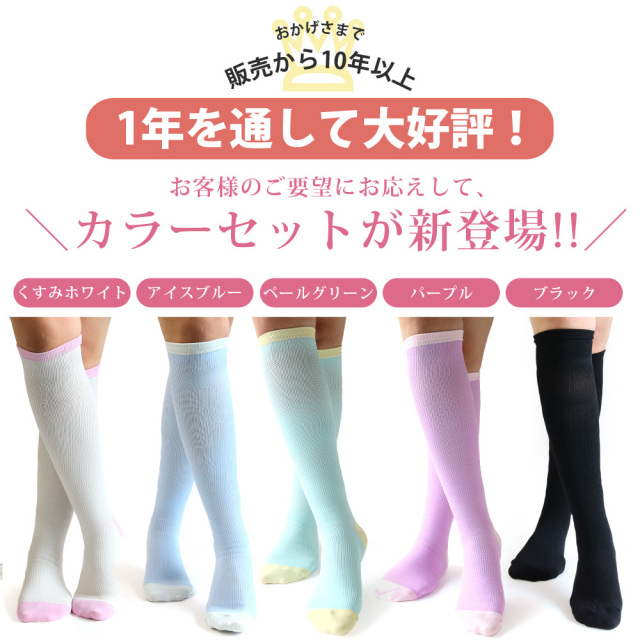 ※黒セットの商品と5色カラーセットの商品では、締め付ける圧力や靴下の形が若干異なりますので、予めご了承くださいませ。 ●脚をスッキリ引き締め、美しいラインをつくる。立ち仕事、座りっぱなしの仕事の方にオススメです。 |